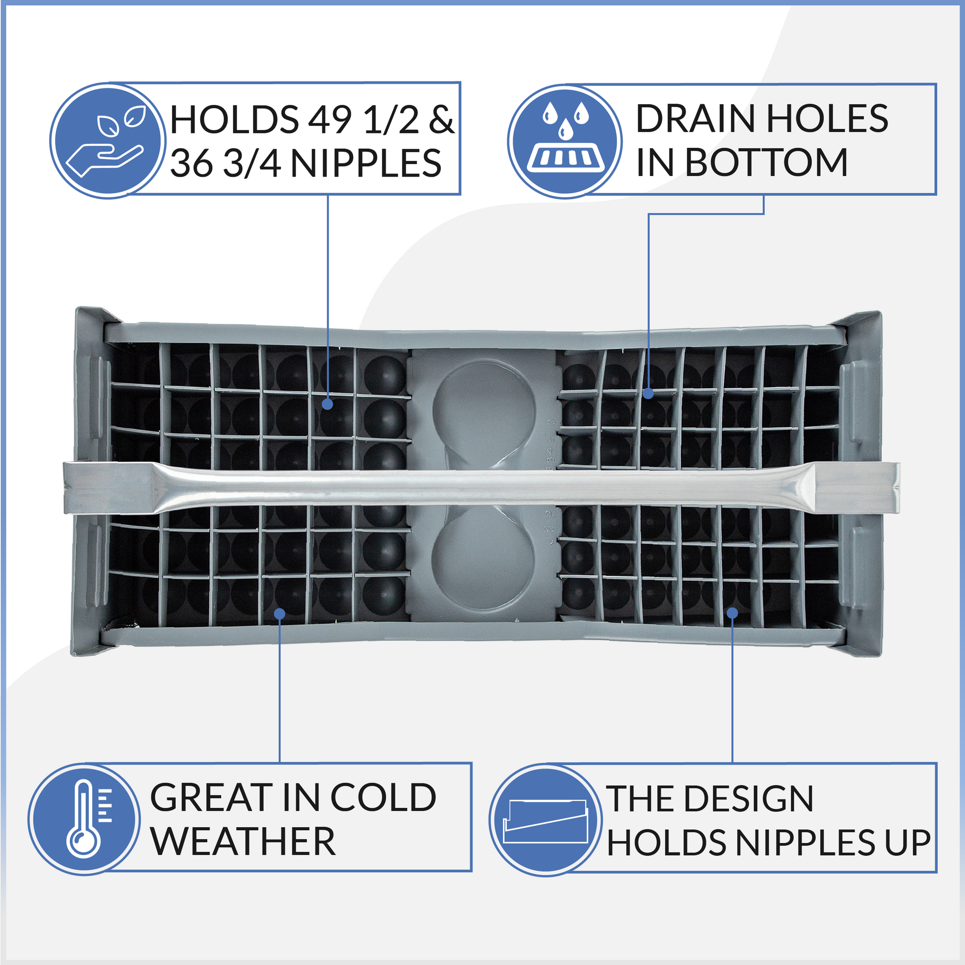 Nipple Caddy combo holds 36 of 3/4" nipples and 49 of 1/2" nipples two pint cans, strong no-rust HDPE plastic